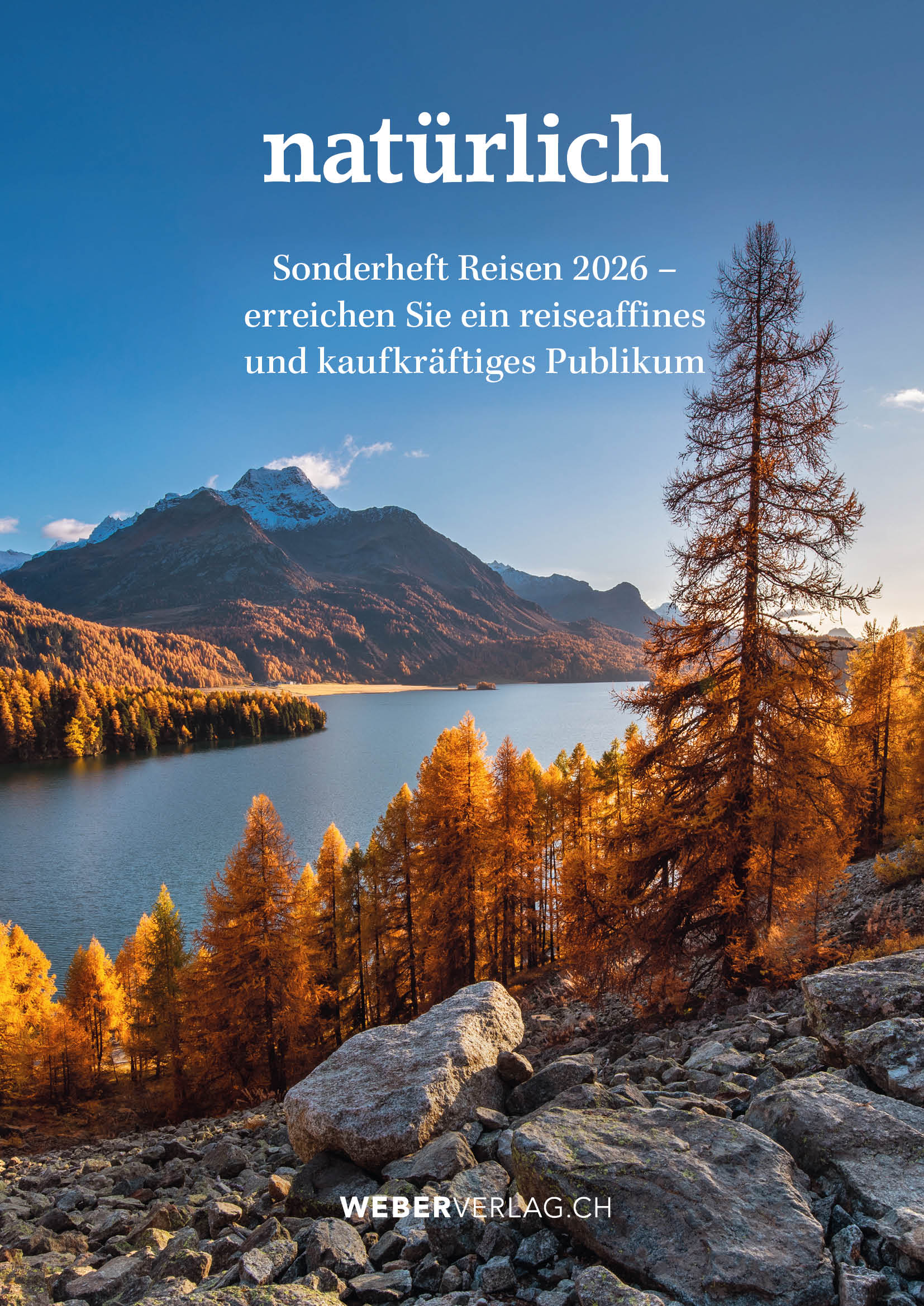 Mediadaten Reisen als PDFDas Sonderheft Reisen erscheint als Beilage der Ausgabe 5/25 natürlich (Erscheint am 27. August 2026) und wird zusätzlich in den Newslettern (natürlich, MIS Bärn exklusiv, Dolce Vita, Thun Magazin) mit rund 50 000 Empfänger:innen versendet.