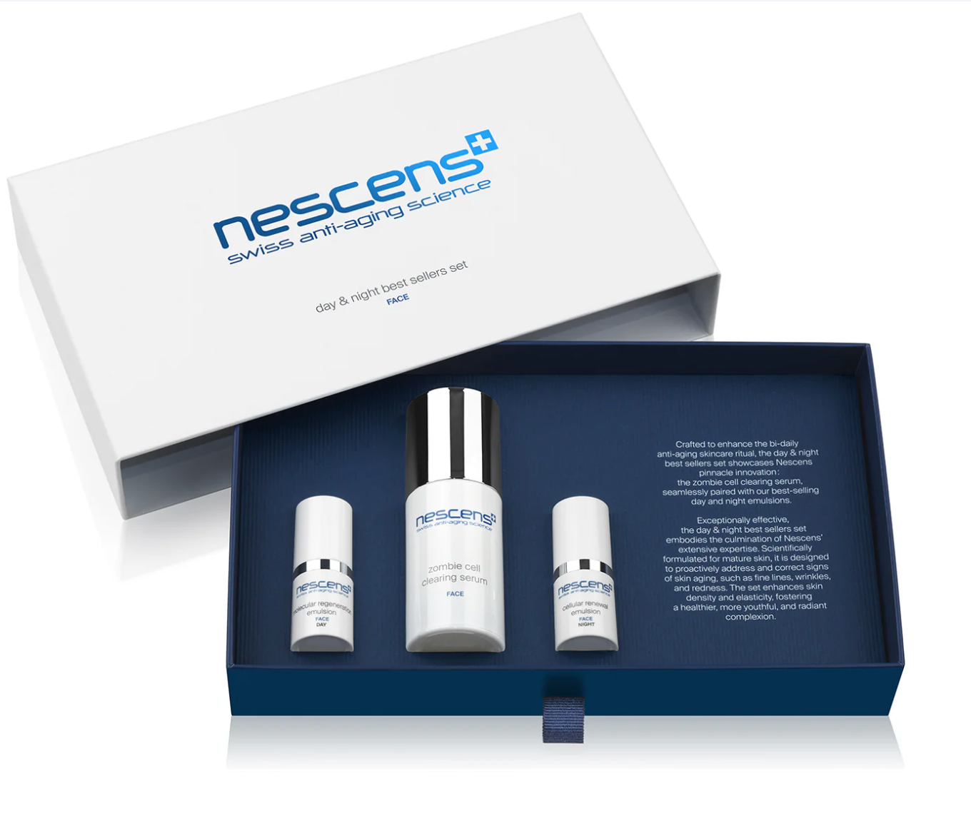 Verwandeln Sie Ihre Hautpflegeroutine mit dem Nescens Day & Night Best Sellers Set. Erreichen Sie rund um die Uhr strahlende, jugendliche Haut mit diesen essentiellen Produkten: das Serum zur Beseitung von Zombie-Zellen, kombiniert mit unseren meistverkauften Tages- und Nacht-Emulsionen. Aussergewöhnlich effektiv, verkörpert das fortschrittliche Anti-Aging-Hautpflegeset den Höhepunkt der umfangreichen Expertise von Nescens.